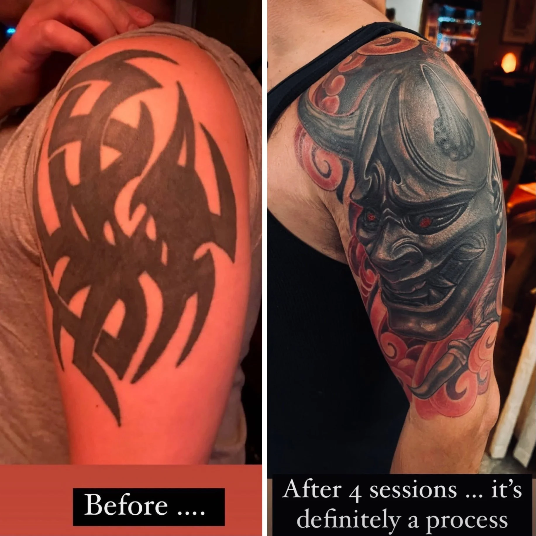 Cover-ups aren’t typically a “one-and-done” deal. Depending on the complexity and how much of the old tattoo needs to be masked, the process can take 3–5 sessions (sometimes more).